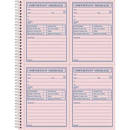 Telephone message pad offers a great way to keep track of important phone calls and pass along high-priority messages. Easy check-off boxes on the two-part carbonless forms indicate the type of call and response required. Write a complete record of your message on the pink original and keep a canary duplicate for future reference. Carbonless duplicates mean no messy carbons. Spiral binding allows you to keep a permanent copy for your records. Pad has four messages per page and a total of 200 sets.