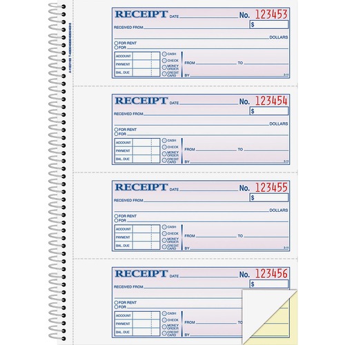This spiral-bound receipt book is a great way to record all cash transactions. Spiral binding allows you to keep all consecutively numbered records in one convenient location. Carbonless duplicates mean no messy carbons. Each two-part form indicates a place to record date, payer’s name, purpose of payment, payment amount, time period that the amount covers, amount due, amount paid, balance and signature of recipient. Convenient circles with preprinted “cash,” “check,” “credit card” and “money order” let you check off method of payment. Paper sequence is originals in white and duplicates in canary. With SFI Certified Sourcing, the fiber used in these forms was obtained from responsible and legal sources.