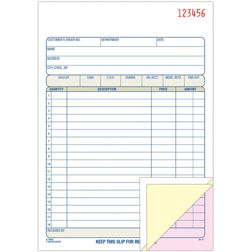 Carbonless sales book offers multiple copies of transactions with each set consecutively numbered. Each three-part form includes areas for customer information, order number, terms, date, shipping information and salesperson. Provided columns offer places to enter quantity, description, price and amount. Space at top offers space for your company stamp. Use wraparound cover to place between sets. Paper sequence is originals in white, duplicates in canary and triplicates in pink. Book includes 50 sets made with premium-grade paper.