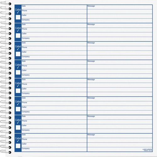 Voice mail log is a great way to track all of your voice mail messages. Convenient check-off boxes next to each message allow you to mark when calls or actions have been completed. Spiral binding allows book to lie flat. Pre-printed message details include date, phone, caller, company and message. Each page includes eight messages. With SFI Certified Sourcing, the fiber used in these forms was obtained from responsible and legal sources.
