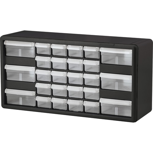 Strong plastic cabinet organizes and protects your small supplies and other components. Cabinets stack securely and can also be wall-mounted with keyhole slots. Clear unbreakable drawers offer easy content identification. Finger-grip drawer pulls provide easy access. Rear stop tabs prevent contents from spilling. Frame is made of one-piece, high-impact plastic. Dividers are molded into the back of the cabinet.