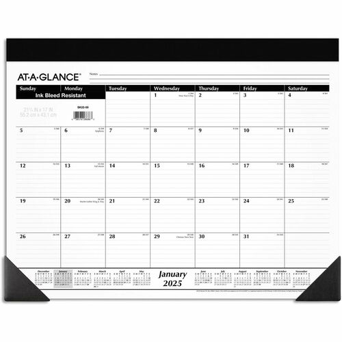 Refillable desk calendar offers a classic black-and-white design and ruled areas for detailed, neat planning. Dated planning pages range 12 months from January to December. One-page-per-month format includes ruled daily blocks (3″ x 2-1/4″), Sunday-through-Saturday scheduling, count of days/days remaining, and a full-year calendar reference at the bottom. Desk pad also features a black headband and two poly corners.