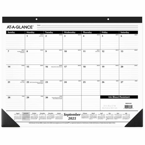 Academic desk pad delivers extended scheduling power with 16 months of planning and offers a classic black-and-white design. Dated planning pages range from September to December. One-page-per-month format offers large ruled daily blocks (2-7/8″ x 2-3/8″), Sunday-through-Saturday scheduling, count of days/days remaining, and a full-year calendar reference along the bottom. Desk pad has a black paper headband, two eyelets for hanging and two black poly corners on the bottom. Nonrefillable calendar is printed in black ink on quality paper.
