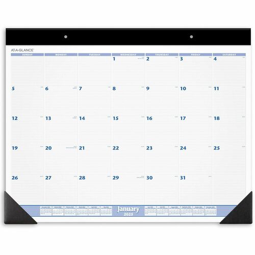 Desk pad protects your desk and keep up-to-date with classic styling. Dated planning pages range 12 months from January to December. One-page-per-month format includes ruled daily blocks (3-1/4″ x 2-3/4″), Sunday-through-Saturday scheduling, count of days/days remaining, and full-year calendar reference along the bottom. Desk pad is framed with a wide black headband and black ploy corners. Use eyelets in the headband for hanging. Calendar pages are perforated for clean tear-out and printed in blue and gray ink on quality paper.