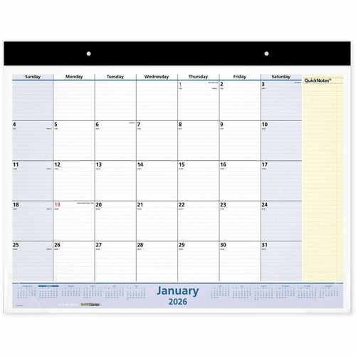 Desk pad offers crisp, clean planning space for each month with shaded weekends and a special yellow QuickNotes area for note-taking. Dated planning pages range 13 months from January to January. One-page-per-month format includes a QuickNotes column, large ruled daily blocks (2-1/2″ x 2-1/2″), Sunday-to-Saturday scheduling, shaded weekends, count of days/days remaining, federal holidays in red and two past, current and 10 future months reference. The current reference month is highlighted with a red box for easy identification. Calendar pages are perforated for clean tear-out and printed in blue, red and yellow ink. Desk pad also includes a black headband with eyelets for hanging and clear poly corners.