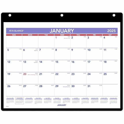 Desk/wall calendar features a user-friendly pocket design that lets you protect your calendar pages and easily slip in a refill. Calendar is housed in a protective, vinyl-backed holder with clear, vinyl view front. Pocket-style closure allows easy removal and better protection of pages. Holder edge is three-hole punched for binders or wall mounting. Clear cover can be used with a water-soluble marker. Dated planning pages range 12 months from January to December. One-page-per-month format includes unruled daily blocks (1-1/2″ x 1-1/8″), Sunday-through-Saturday scheduling, count of days/days remaining, and federal holidays highlighted in red. Current month is also highlighted in red in the full-year calendar reference along the bottom. Desk/wall calendar is refillable.