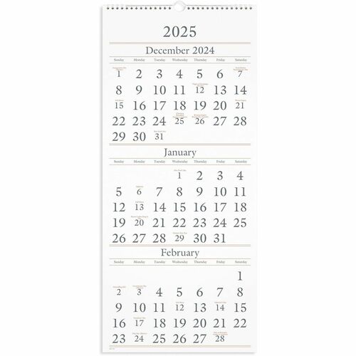 Wall calendar displays three months at a time for thorough planning. Dated planning pages range 14 months from December to January. Monthly wall calendar displays the past, current and future months reference in equal size with large, easy-to-read numbers. Each month includes Sunday-through-Saturday scheduling and holidays. Wire binding has a loop at the top for easy hanging. Calendar pages are printed in two inks on premium buff paper and are supported by a full chipboard back.
