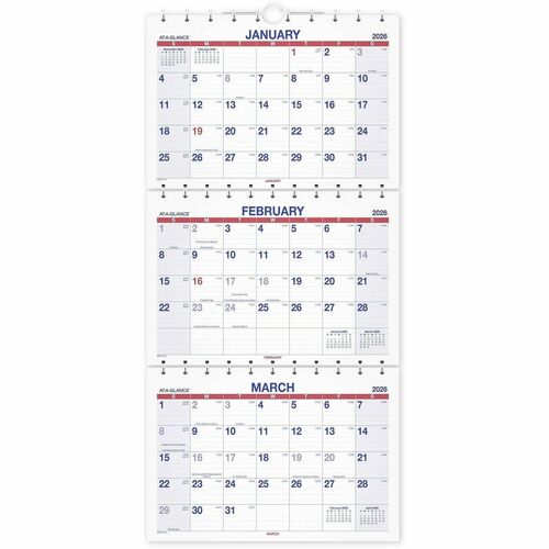 Wall calendar makes it easy to look to the future with three months of reference all on the same page. Unique binding lets you move each month to a new position so no need to rewrite anything. The past, current and future months are printed in equal size in a vertical format. Dated planning pages range 15 months from December to February. Monthly entries have large, easy-to-read numbers in ruled daily blocks (1-5/8″ x 1-3/16″); numbered weeks; count of days/days remaining; Sunday-through-Saturday scheduling; and federal holidays printed in red. Wire binding at top is equipped with a built-in hanger for easy wall-mounting. Full chipboard backing provides a sturdy backing for writing. Wall calendar is printed red and blue ink on quality paper.