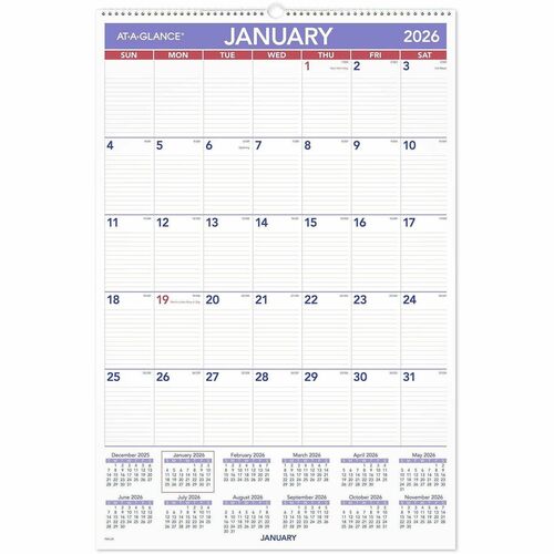 Keep track of deadlines and key events with this monthly wall calendar that is loaded with room for scheduling to track projects, schedule vacations and plan the future. It is perfect for cubicles and work spaces. Dated planning pages range 12 months from January to December. Plan your schedule without fear of distracting ink bleeding. High-quality paper is designed for ink bleed-resistance to help keep plans legible. One-page-per-month format features ruled daily blocks to keep reminders neat, Sunday-through-Saturday scheduling, federal holidays highlighted in red, 12-month calendar reference along the bottom for quick date-checking, count of days/days remaining and plenty of writing space. White twin-wire binding includes a built-in wire, hanging loop for easy display on your wall. Calendar is printed in blue and red ink.