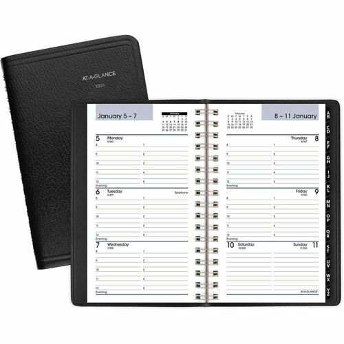 Compact planner will help keep you organized and on schedule with easy planning on the go. Weekly pocket planner features two-page-per-week spreads, perforated corners for easy reference, a tabbed telephone/address section, and simulated leather wirebound cover. Dated planning pages range 12 months from January to December. Each spread includes ruled daily entries in a horizontal format, hourly appointment times from 8 AM to 5 PM on weekdays, Monday-through-Sunday scheduling, count of days/days remaining, a two-color format (black and blue ink), and current and future months reference. Calendar is nonrefillable.