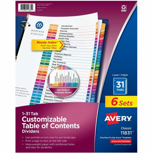 Organize your documents quickly and easily using these Ready Index Dividers with customizable table of contents. No tab inserts or labels are needed. Double-sided section title page and tab dividers provide the flexibility to use the dividers in either a portrait or landscape format. Tabs feature the numbers 1 through 31 preprinted for easy access. Heavyweight paper, double-sided reinforced holes and extended tab reinforcements provide added durability. Dividers are great for project binders, meeting materials, reference or training manuals, archiving and more. Easily customize your table of contents page with a logo, name, date or project title using free online templates and designs.