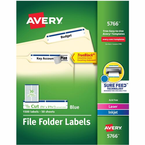 Create professional-looking file folder labels for easy and quick file identification. Labels with TrueBlock completely cover everything underneath so you can reuse mailing tubes, boxes and more. Bright white labels have permanent adhesive that sticks without lift or curl. Each sheet of labels is acid-free, jam-free and smudge-free. Each sheet has labels sized to fit 1/3-cut tabs. File folder labels are compatible with inkjet and laser printers. Avery offers many easy-to-use templates for Microsoft Word and other popular software programs.