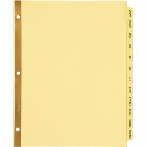 Preprinted laminated dividers offer gold RipProof reinforcing that prevents pullout at binder holes. Laminated tabs are printed front and back with easy-to-read characters. Preprinted, monthly tabs range from January to December. Dividers offer quality buff paper and single gold-reinforced binding edges.