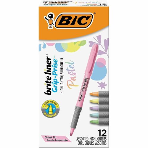 Brite Liner Grip Pastel Highlighters make organization easy and fun. These highlighters can be left uncapped for up to 8 hours without drying out to help you work with confidence. Each highlighter features a textured grip for added comfort and control. Whether you need broad coverage or precise underlining, the versatile chisel tip makes switching line widths simple and seamless. This pack contains a fun, trendy assortment of soft pastel colors in yellow, pink, blue, green, purple and orange.