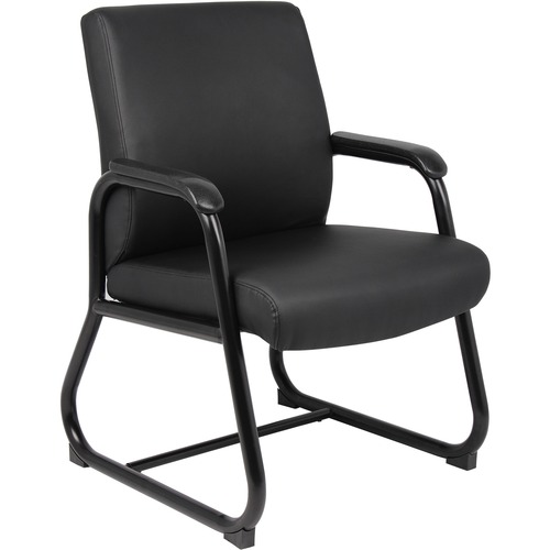 This heavy-duty guest chair is upholstered with Caressoft vinyl that gives you the look and feel of leather, yet is more durable and can be cleaned easily with a damp cloth. Padded, stationary arms are ergonomically shaped for comfort through extended use. The chair is at a fixed height and sits on a sturdy, stationary sled base. Its sleek style offers a minimalist seating option for most any room or office. Guest chair supports up to 300 lb.