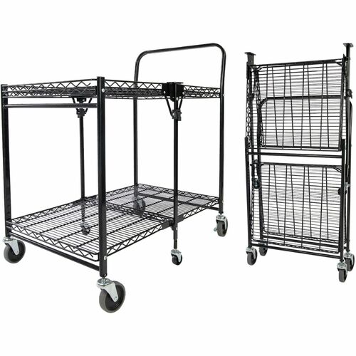Multipurpose cart folds, rolls and locks for a three-in-one storage unit that’s ideal to hold any heavy equipment in any retail area. With a high capacity and massive storage space on the dual shelves, the Stowaway Folding Utility Cart works well for any commercial storage. Tough, chrome-plated, stainless steel fits well in warehouses, medical facilities, restaurants, auto shops, offices and more. Heavy-duty storage cart with wheels features a patented folding design that takes up four times less space. It folds and unfolds in a fraction of a second with secure safety locks for the strongest durability. Six swivel, caster wheels (including two locking) deliver skid-free rolling and movability so cart can be used for easily transporting supplies, boxes, equipment and more. Nonmarring wheels’ 360-degree rotation allows smooth movement, and mini wheels offer extra support. Wall-mount bracket (not included) allows easy storage behind a door or in an open space.